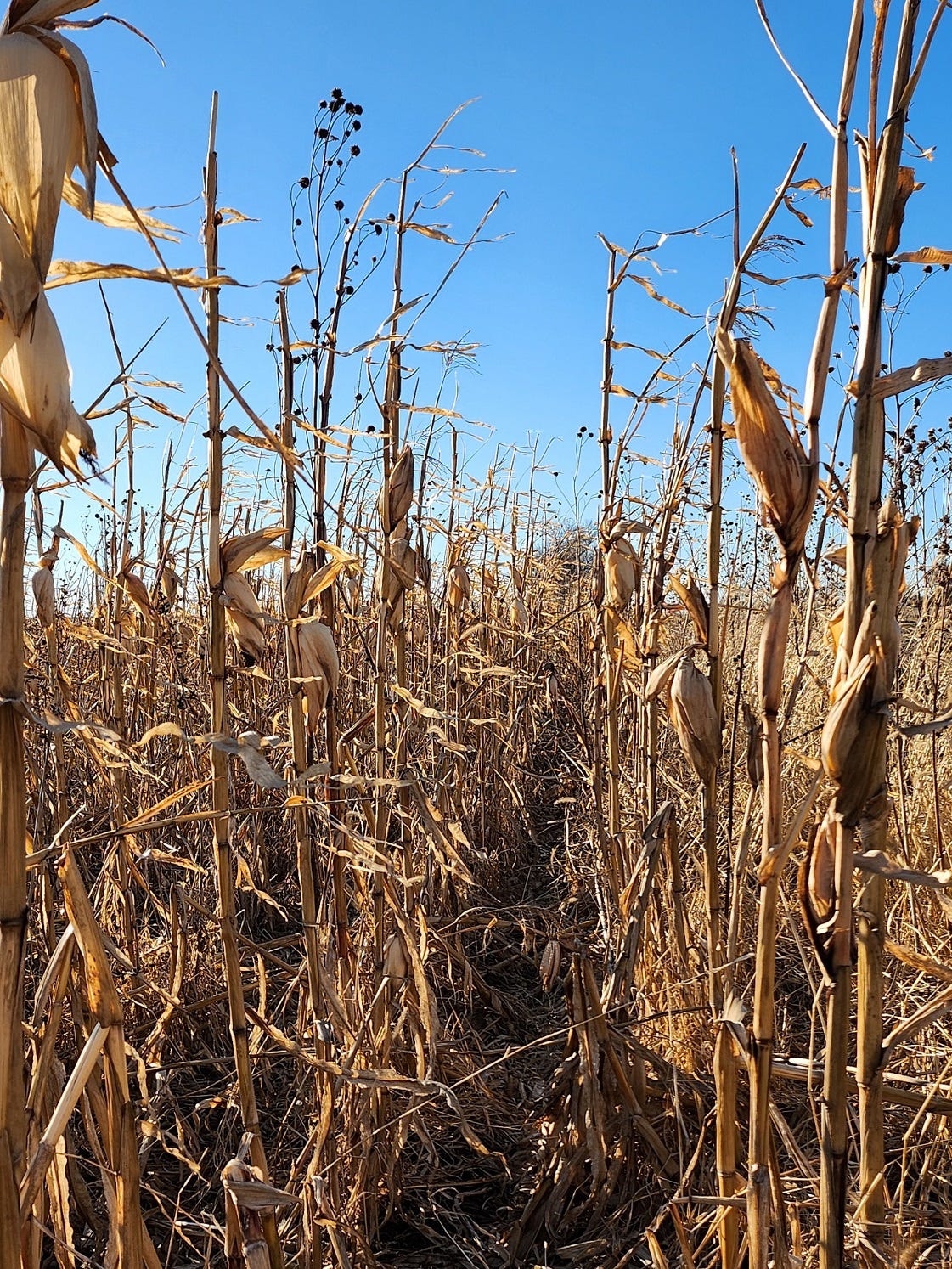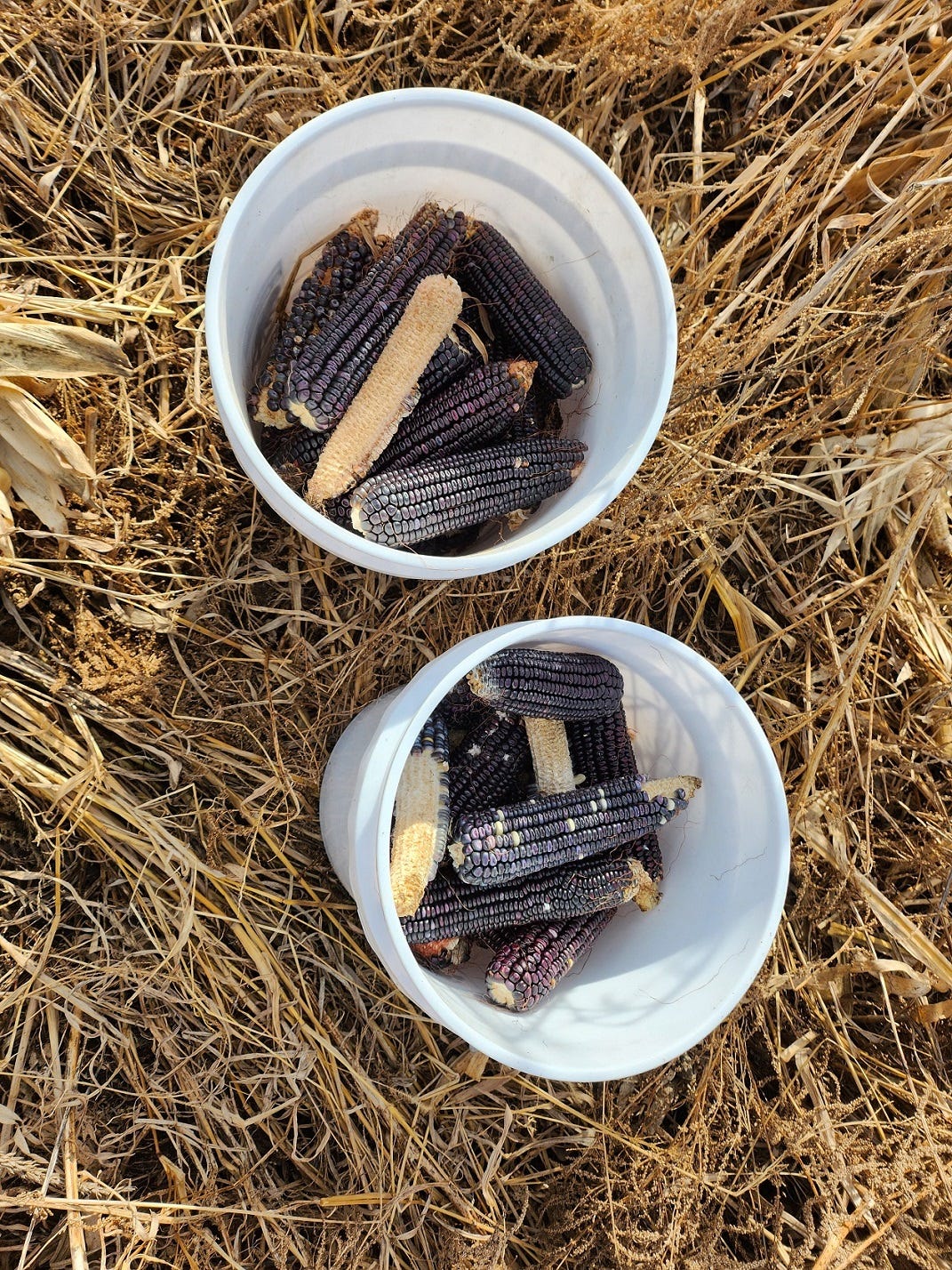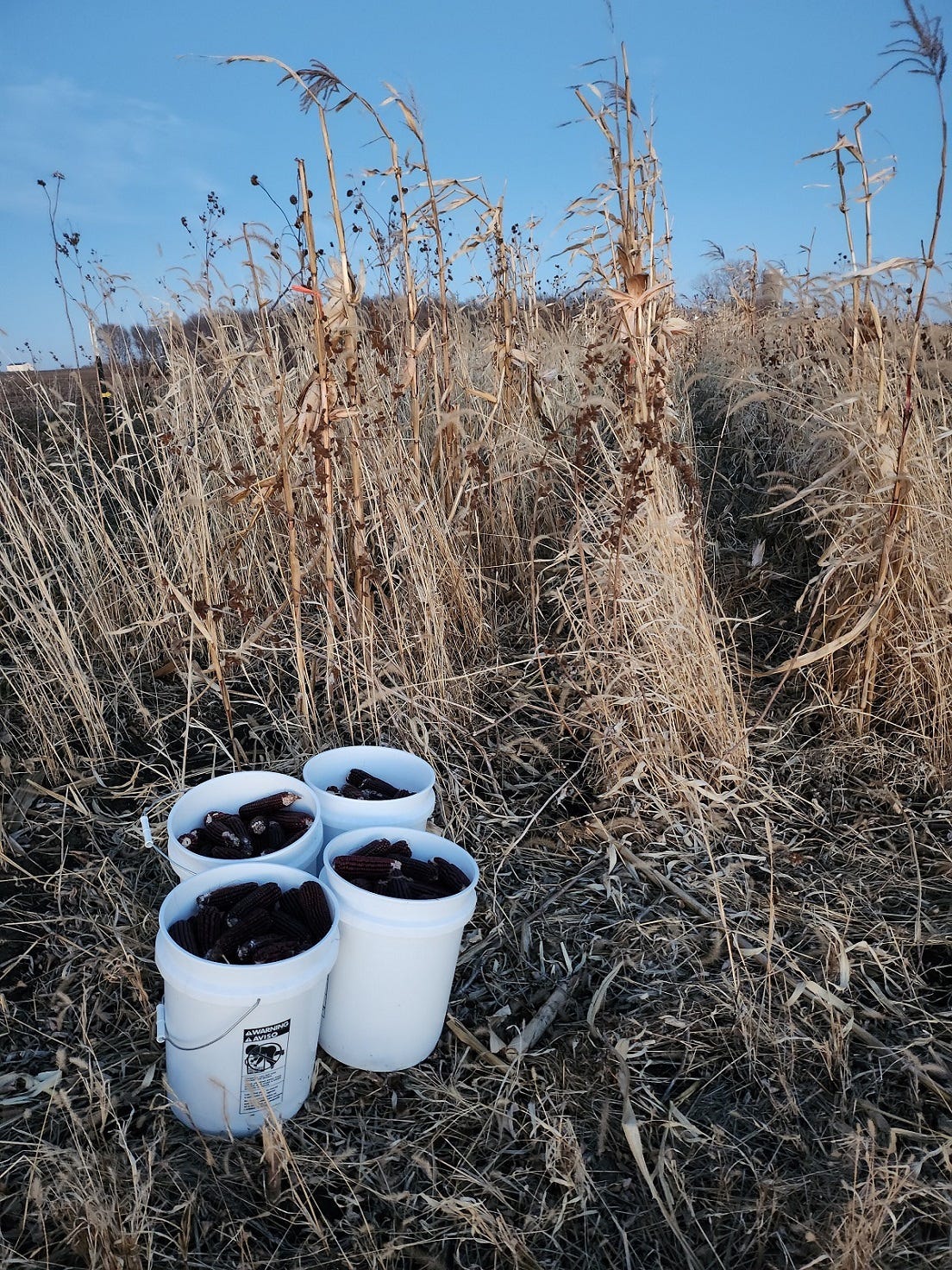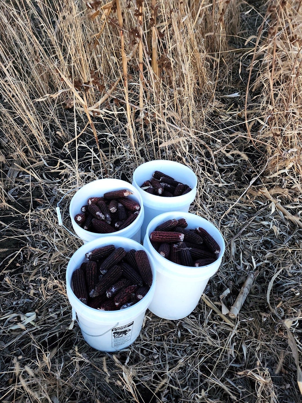 In my region, late November often sees the start of winter, as with the projected winter storm bearing down on us today, so my first run through the Bloody Butcher certainly seemed to be the end of the fall corn picking season and anything after that will be “winter” corn. I’m heading for more northern latitudes to help my Army “kid” move back to Sodak land and thus, I probably won’t be back out in the Bloody Butcher until mid-December. Its continued easy access is unknown at this point, 4-wheel drive pickup trucks can get through some snow on dirt trails but in deeper snow, it becomes more problematic. I’ve sledded corn out before in the winter and banana buckets stay in sleds better than 5-gallon buckets so we’ll see what happens. Maybe the Army “kid” will use the standing Bloody Butcher as a deer blind for the couple of seasons that will still be open to him when he gets back in state. He has shot a deer before out of my colored corn efforts. Trudging through snow can be good physical exercise and I just have to pay for the gasoline to get there and not any money for a gym membership 😊.