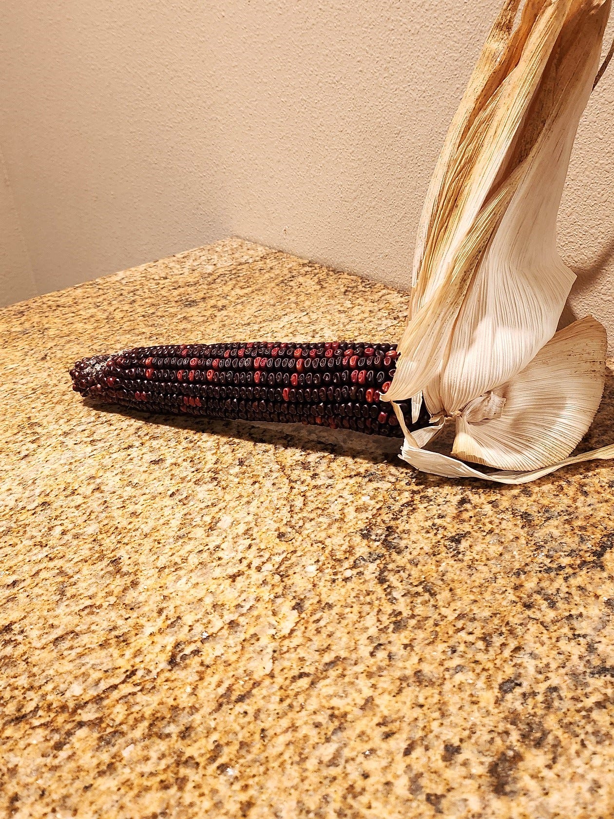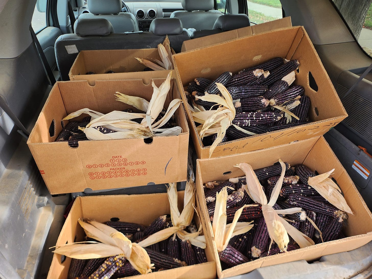 My first OBC pick in mid-October got through the first two rows (the rows on this side of the patch were more complete with the population of plants compared to the other side) and yielded four banana boxes. I wrote the date of the pick on the side of the boxes when I got home and decided that these ears probably needed to wait, including several days in the sun on the backyard patio, before I tried shelling them because they were still “too” wet for easy kernel removal and later storage, although some were already dry enough. The standard phenotype of the OBC were either complete ears of dark blue kernels or mostly dark blue with a few scattered white or pearl-ish colored ones, although this ranged to a violet hue of the blueness or a much more even mix of blue and white kernels or yellow kernels instead of white ones as being the minority intermixing of a specific ear. The rarest phenotype output was two-tone red variant of which I maybe found half a dozen complete ones out of the hundreds of ears that I picked over time.