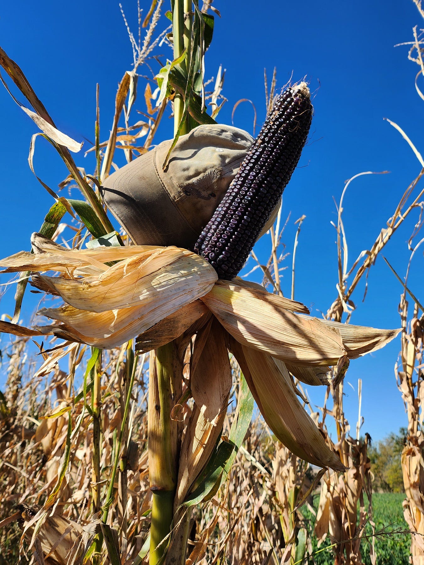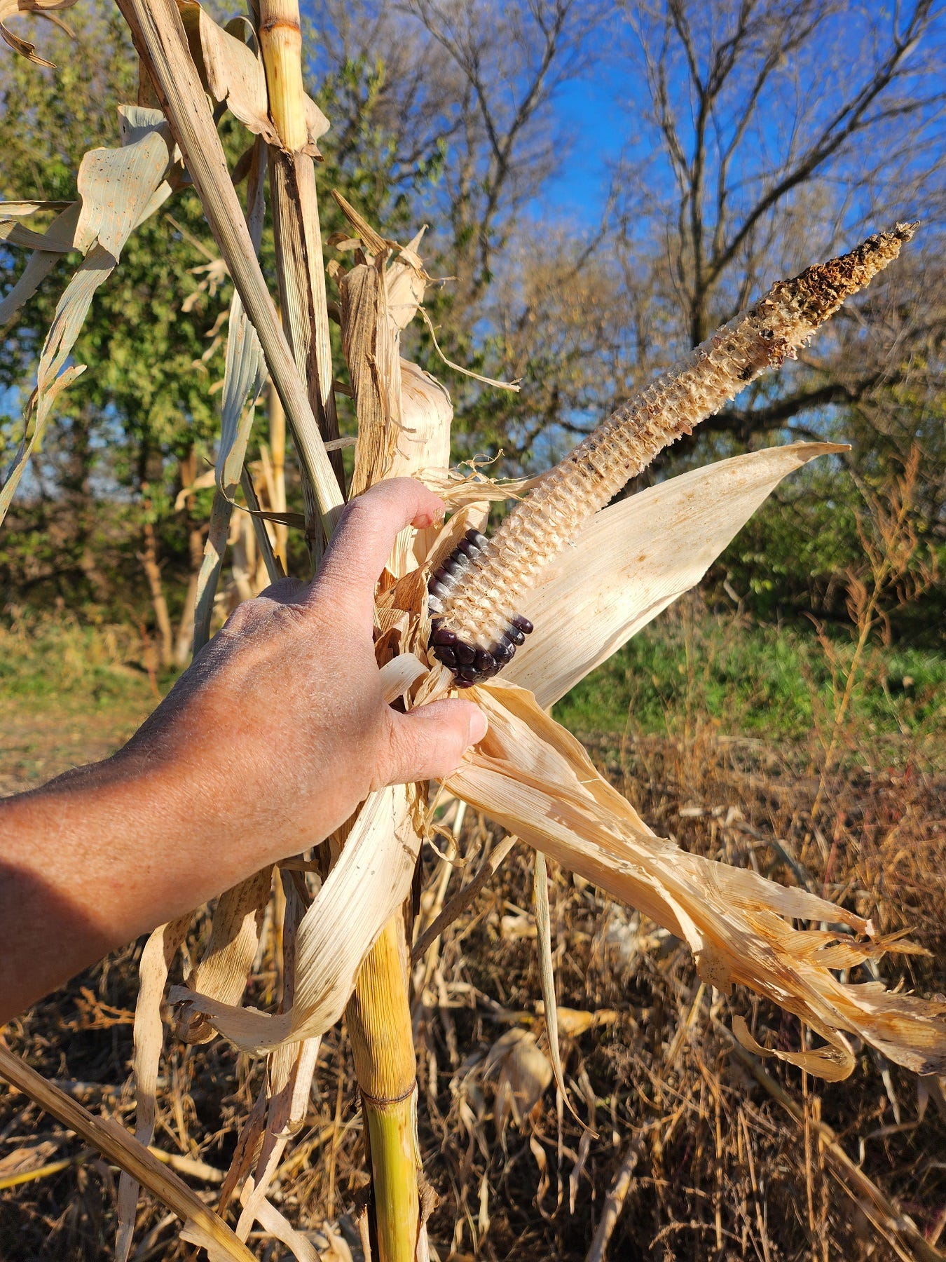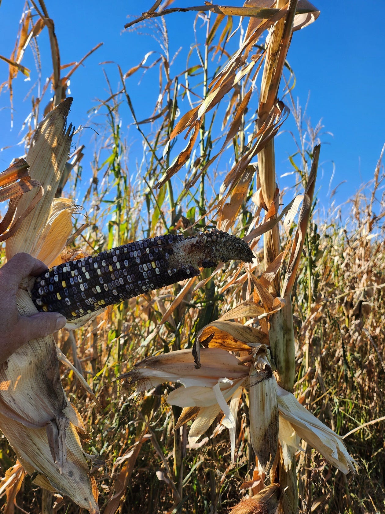 I talked about my three “larger” patches of colored corn recently in the essay entitled, “My ‘Big’ Patches of Colored Corn as Summer Fades into Fall, 2025” which included some initial discussion about the picking of the Montana Morado Maize (MMM), so this essay will mostly concentrate on my harvesting of the heirloom Ohio Blue Clarage (this will be called OBC here) corn over at my friend “Robert’s” truck garden. At the end, I’ll talk about an initial single afternoon effort in harvesting my Bloody Butcher but I suspect that will be covered more in an essay, probably in January, about “winter” corn, along with some common commodity (but organic) yellow corn ear picking to sell as “squirrel corn”. We’ll see how the next six+ weeks play out.