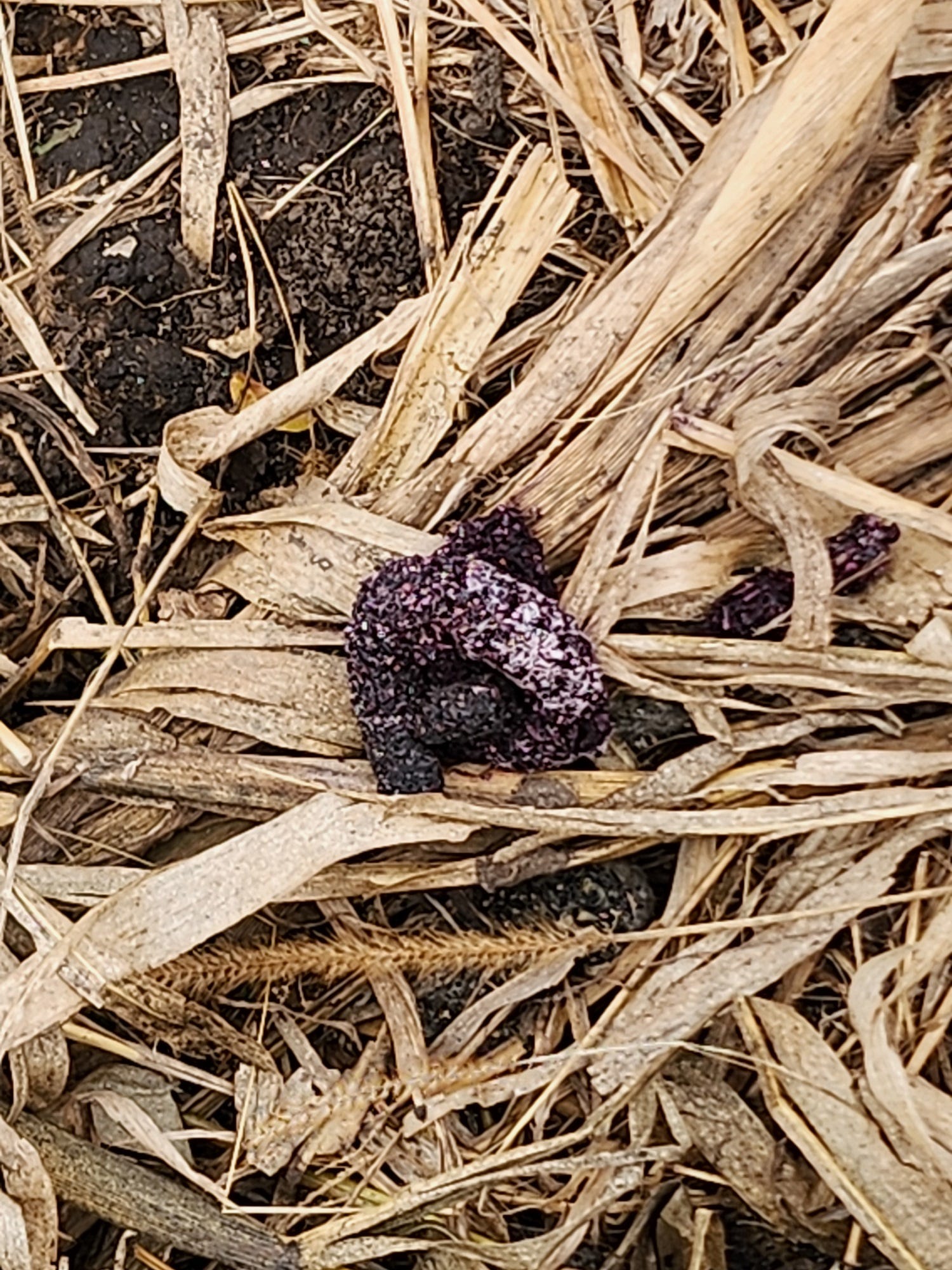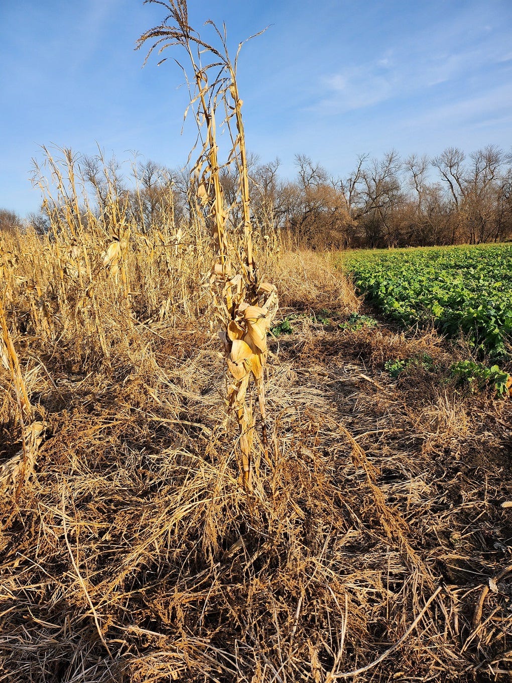 Last day of OBC harvesting, looking through the thinner rows on the end of the patch; A raccoon “calling card” among the rows; In progress picking, more and more partially deer eaten ears showing; The last two OBC ears to be picked, Robert’s cover crop of turnips and radishes off to the right side.