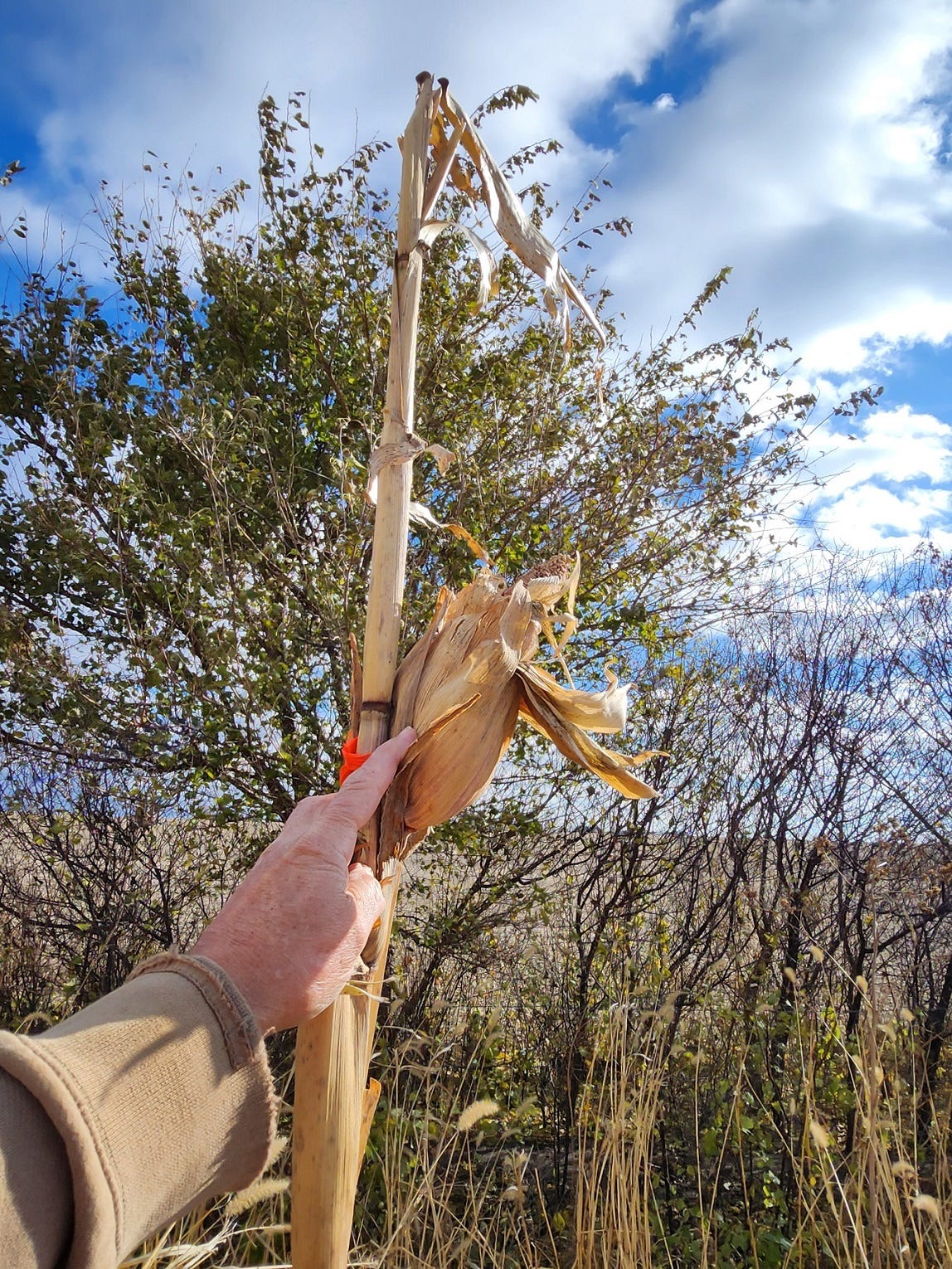 An orange ribbon marked Bloody Butcher plant standing much taller among the shorter dried up MMM stalks; The last and best “wild” Bloody Butcher ear among the MMM oval.